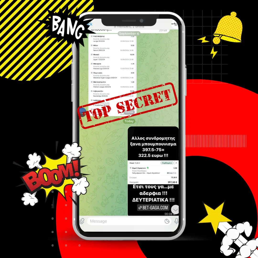 Μπες τώρα στην πιο ολοκληρωμένη στοιχηματική ομάδα της Ελλάδας! Κάνε εγγραφή με αποκλειστικά προνόμια, “κρυφές” πληροφορίες” & live tips στο Telegram κάθε μέρα από τους έμπειρους tipsters μας! Κάθε στιγμή δίπλα σου !
